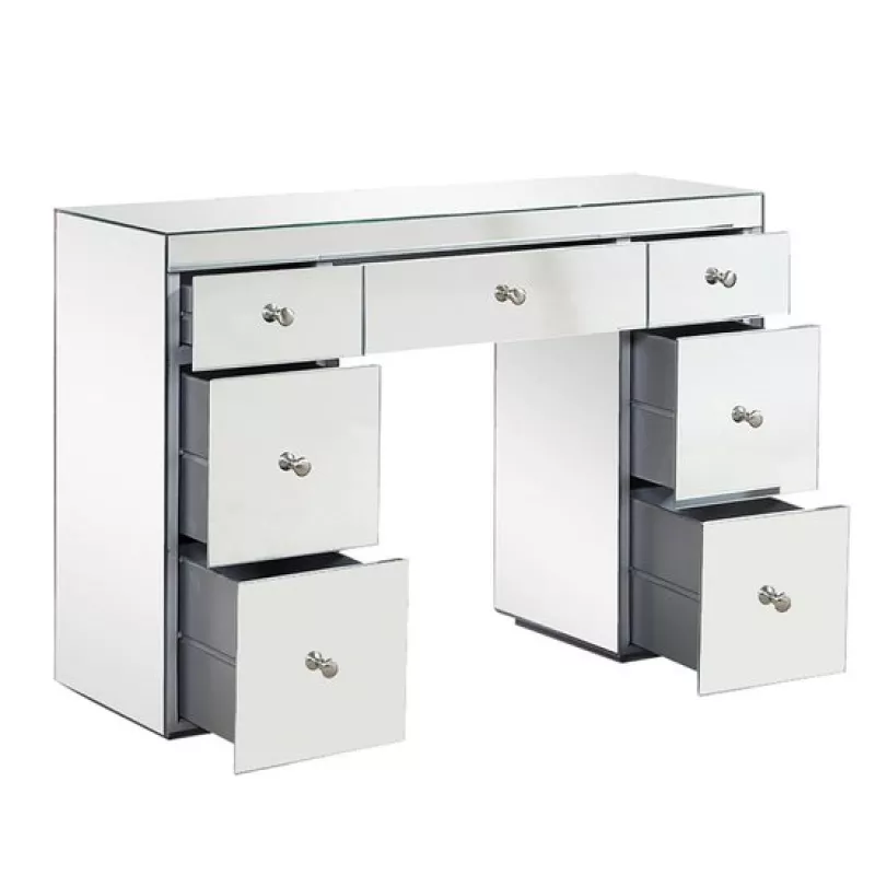 De Hollywood kaptafel staat bekend om haar elegante uitstraling dankzij de gespiegelde afwerking aan de gehele kaptafel. De kaptafel is uitgerust met maar liefs 7 ruime lades en bieden genoeg opbergruimte voor al jouw beauty producten. De lades bevatten een softclose functie en de lades zijn afgewerkt met glazen lade knoppen.