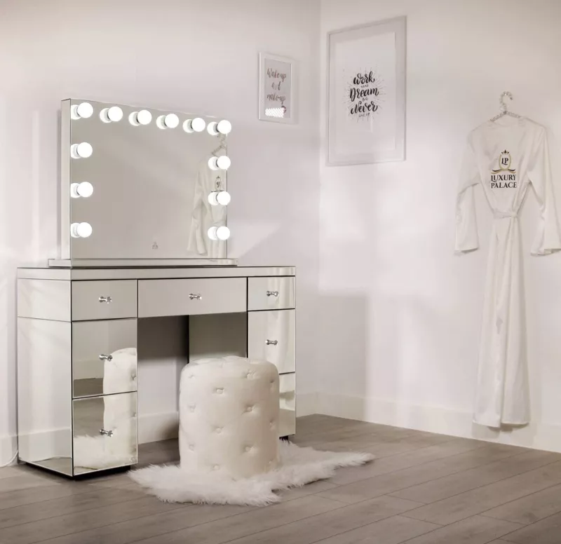 Deze make-up tafel wordt geleverd exclusief spiegel, LED lampen, stoel en make up accessoires.