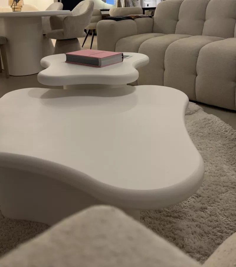 De organische vormen en zachte witte afwerking geven deze tafel een moderne en luchtige uitstraling. Dankzij het unieke design met ronde curves straalt de tafel rust en elegantie uit, terwijl hij toch praktisch en stevig is.