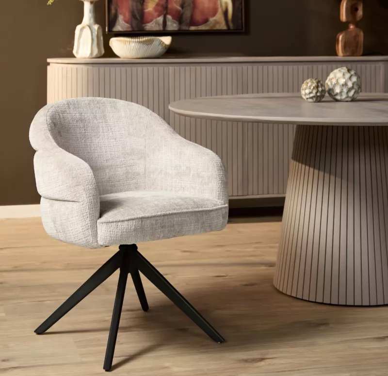 Eetkamerstoel Sig is voorzien van armleuningen, een draaibare zitting en een auto-return mechanisme. De combinatie van de warme bekleding en de metalen poot zorgt voor een modern en stijlvol geheel, terwijl de afgeronde rug met subtiele banen aan de achterzijde het ontwerp extra karakter geeft. Let op: de stoelen worden per twee stuks verkocht!