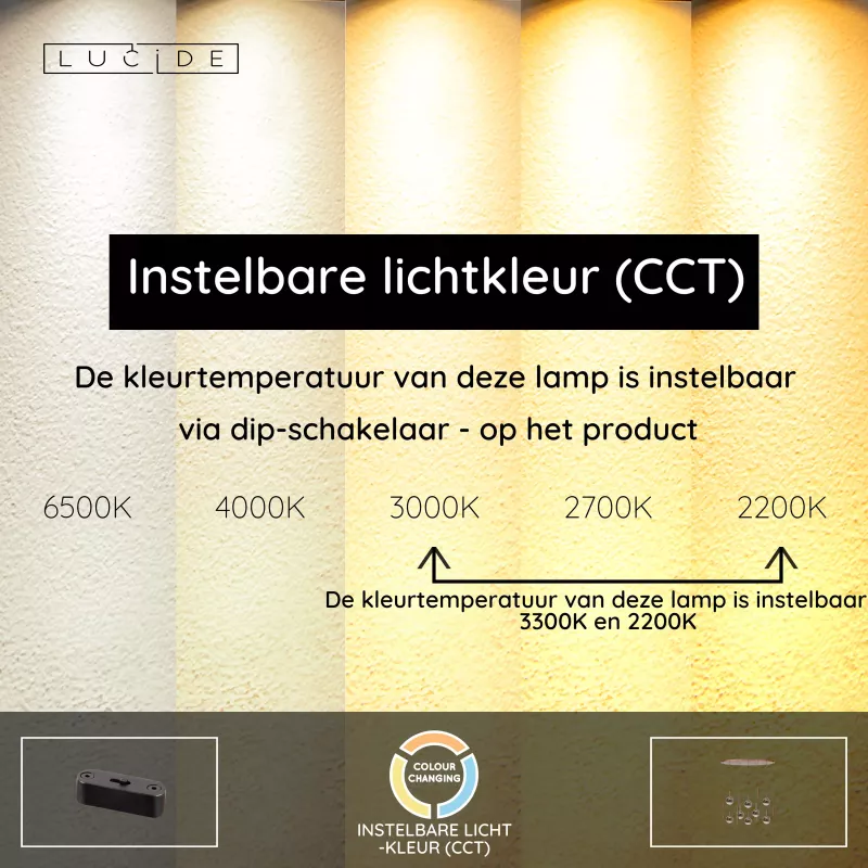 De geïntegreerde LED-verlichting biedt niet alleen energiezuinig licht, maar ook volledige controle over de sfeer. Met de ingebouwde DIP-schakelaar stel je moeiteloos de kleurtemperatuur in van extra warm (2200K) tot natuurlijk warm licht (3300K). Sluit je de lamp aan op een externe dimmer (excl.), dan pas je ook de lichtsterkte precies aan jouw moment aan.